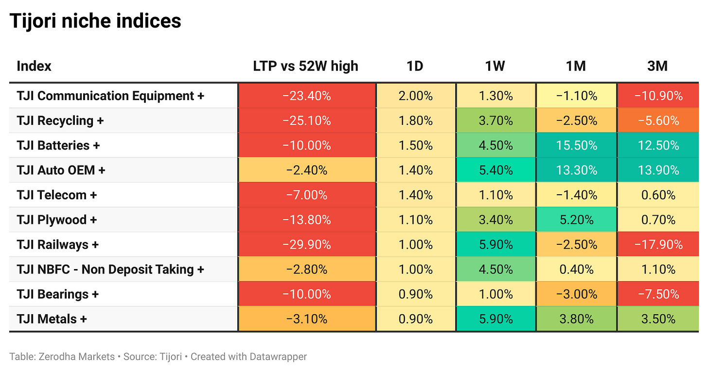 Tijori is an investment research platform, and they have constructed niche indices for various themes and sub-sectors. They help you understand the market performance of narrow slices of the market. You can also track the Promoter buying and other interesting stuff like Capex activity by the companies in the Tijori App’s idea dashboard
