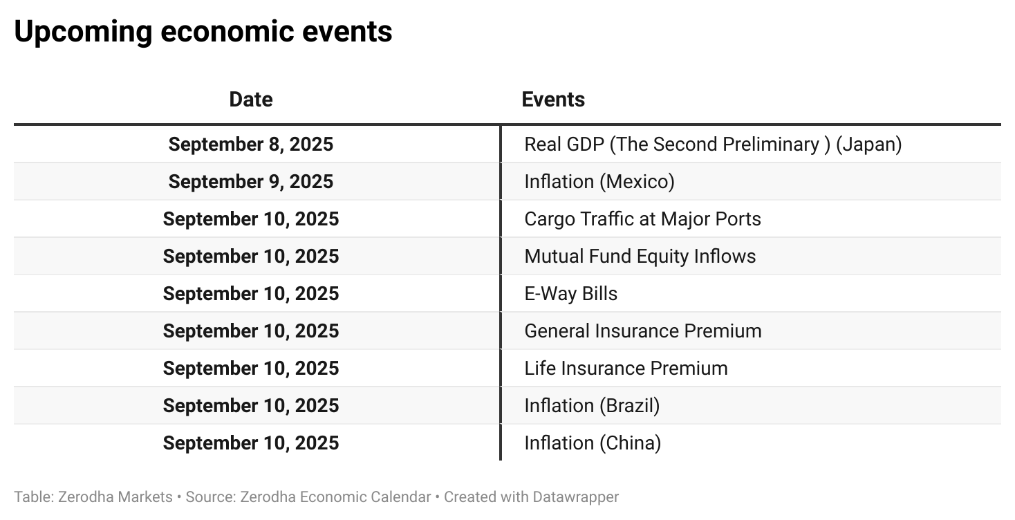 Market sentiment remains cautious, with concerns over 50% tariffs, persistent foreign investor outflows, and muted earnings weighing on confidence. Escalating U.S.-India trade tensions are expected to remain the key driver of near-term market direction.