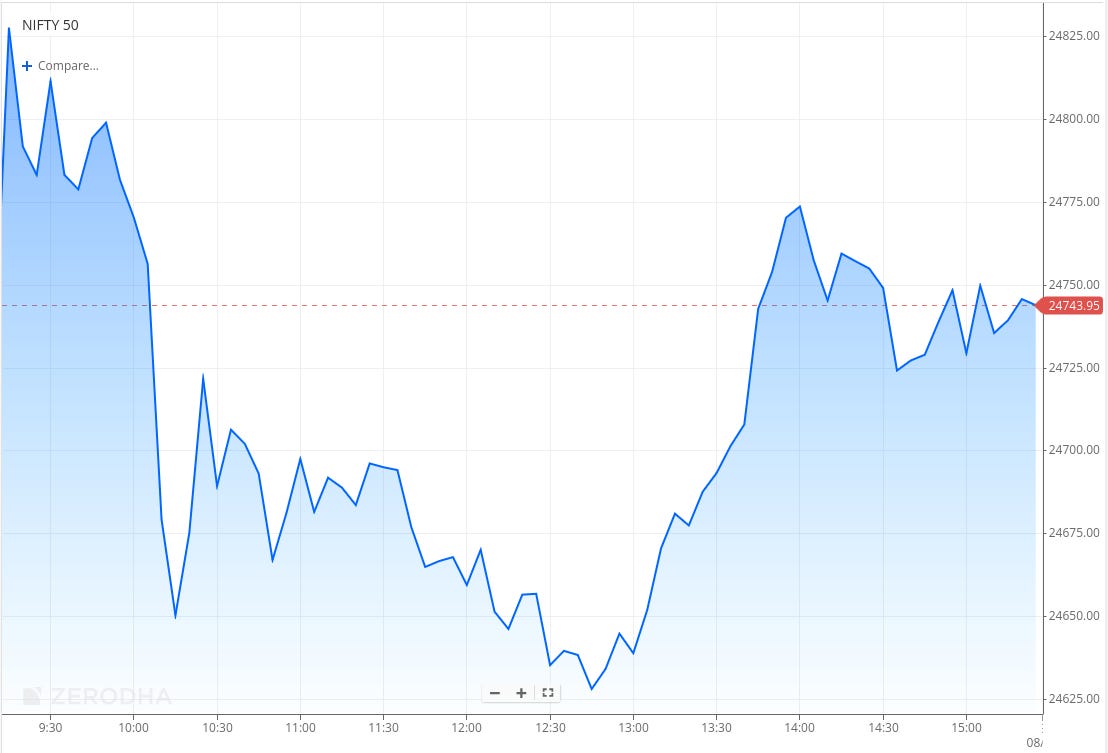In the second half, Nifty staged a sharp recovery, climbing to test 24,770 by 2 PM. However, it failed to sustain those gains and consolidated in a narrow range between 24,725 and 24,755 during the last hour, eventually closing at 24,741, almost flat compared to its opening levels.