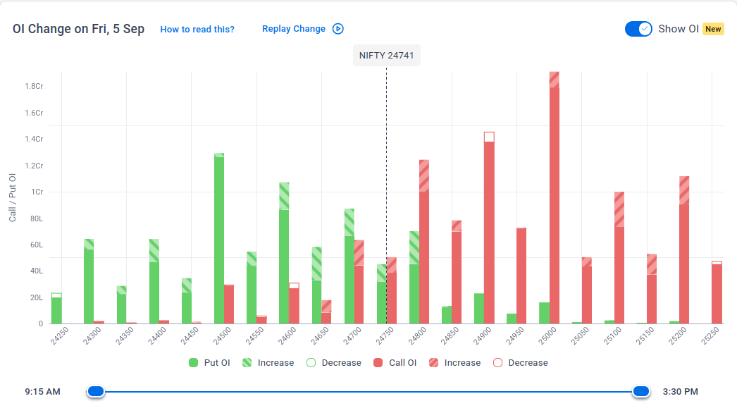 The maximum Put Open Interest (OI) is observed at 24,500, followed closely by 24,600, suggesting strong support at 24,600 to 24,500 levels.