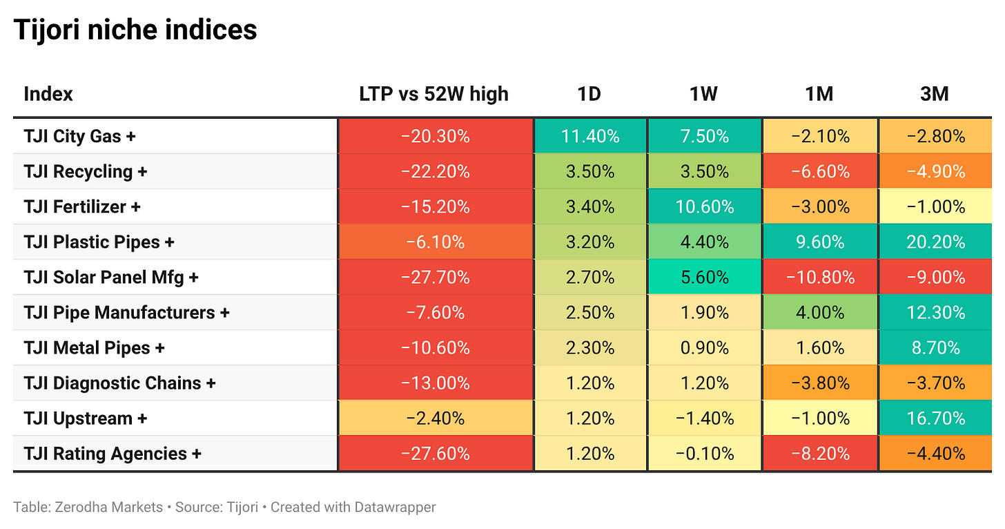 Tijori is an investment research platform that has constructed niche indices for various themes and sub-sectors. They help you understand the market performance of narrow slices of the market. You can also track the Promoter buying and other interesting stuff, like Capex activity by the companies in the Tijori App’s idea dashboard