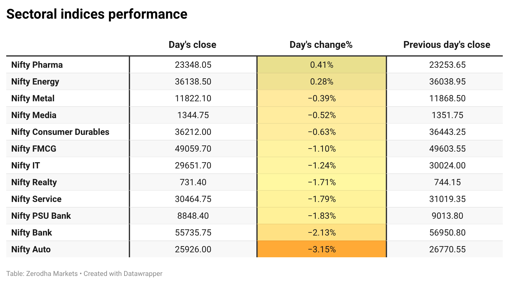 Nifty Pharma was the top gainer, rising 0.41%, while Nifty Auto was the top loser, falling 3.15%. Overall, 2 sectors closed in green, and 10 sectors ended in red.