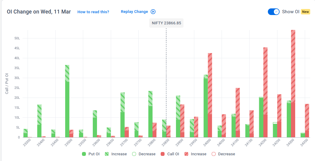 The maximum Put Open Interest (OI) is observed at 23,500, followed by 24,000, suggesting support at 23,700-23,600.