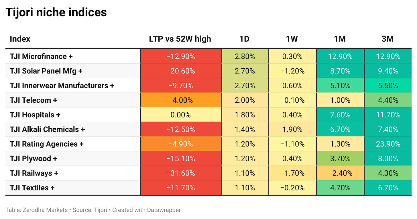 Tijori is an investment research platform, and they have constructed niche indices for various themes and sub-sectors. They help you understand the market performance of narrow slices of the market. You can also track the Promoter buying and other interesting stuff like Capex activity by the companies in the Tijori App’s idea dashboard.