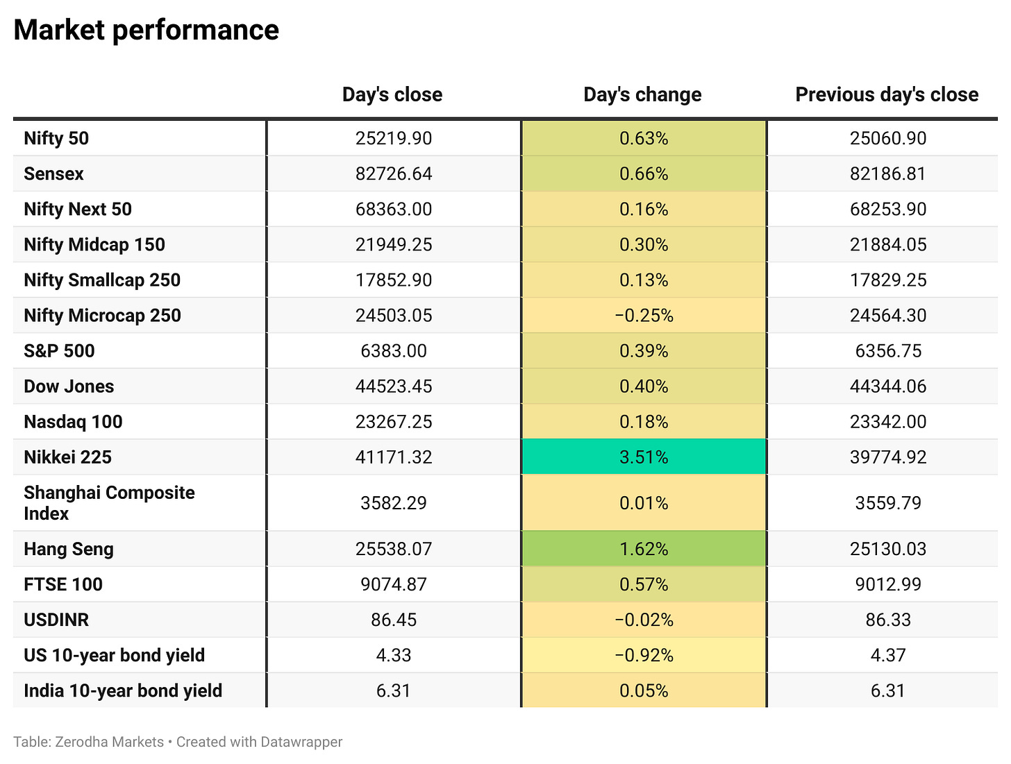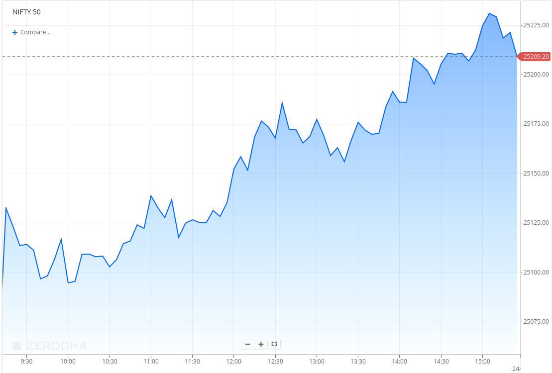 A broad-based rally across sectors lifted the markets, helping Nifty close above the key 25,200 level. Looking ahead, investors remain focused on upcoming earnings announcements and global trade developments.