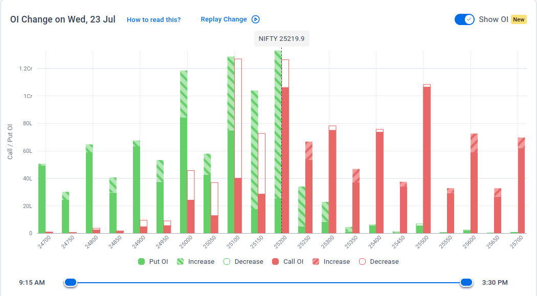 The maximum Put Open Interest (OI) is observed at 25,200, followed closely by 25,100, suggesting strong support at 25,100 to 25,000 levels.