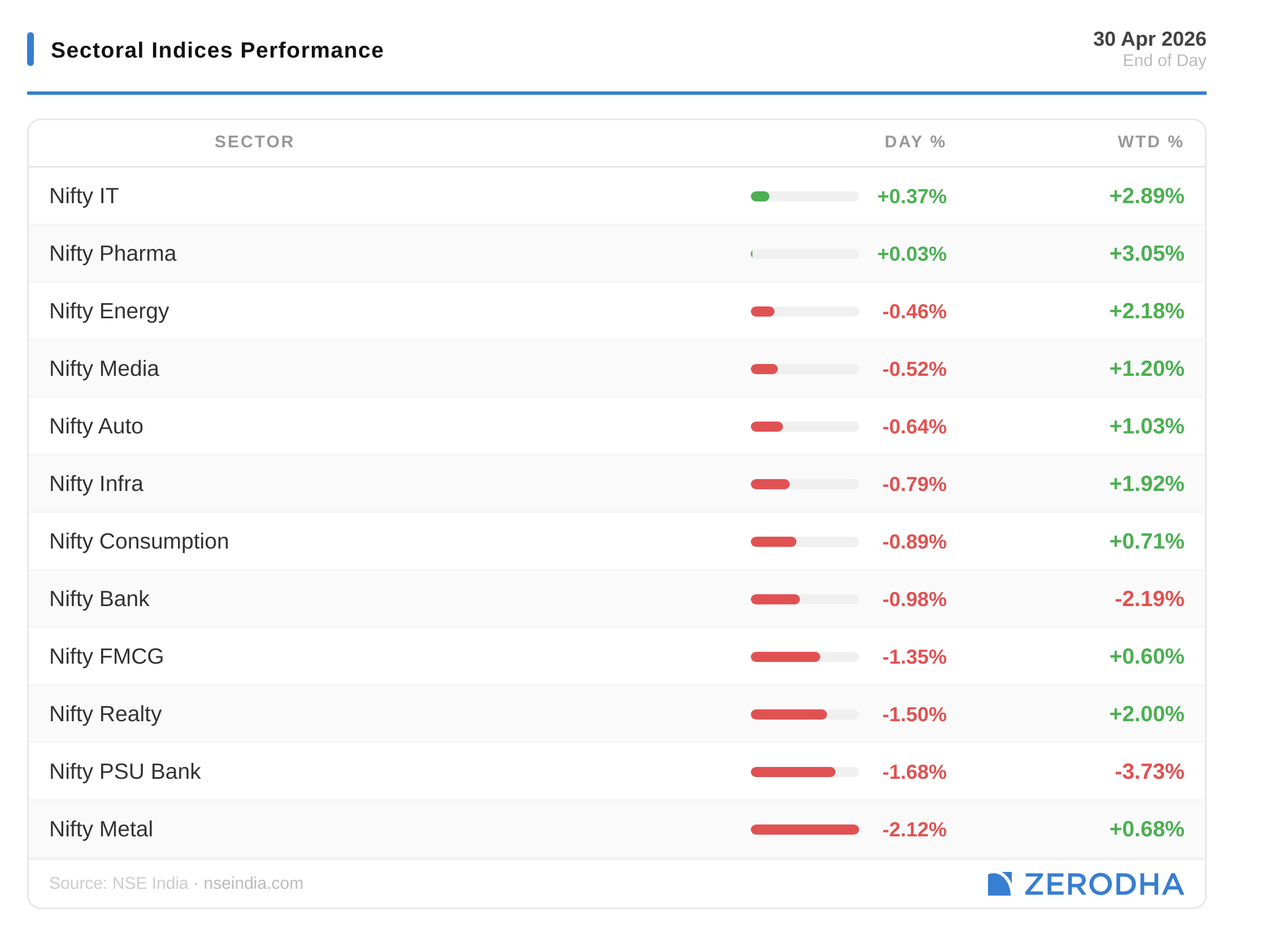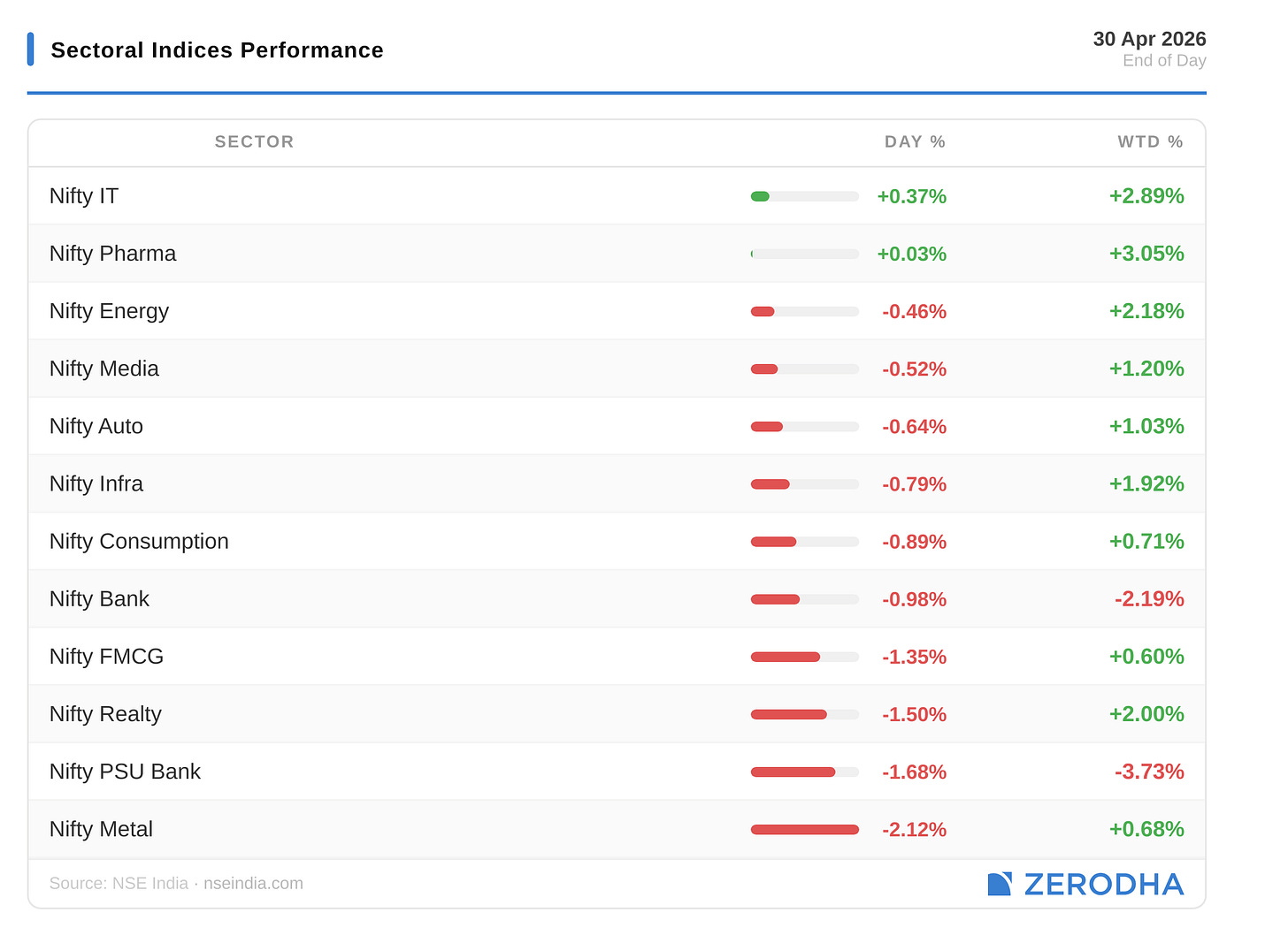 Only IT and Pharma stayed green with 0.37% and 0.03%. Metal collapsed 2.12%, PSU Banks slid 1.68%, Realty dropped 1.5%. Energy and Media both closed red. 10 of 12 sectors bled.