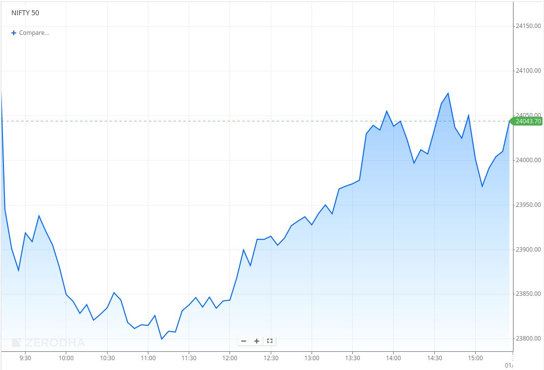 Post noon, buying interest picked up steadily, leading to a strong recovery. The index reclaimed 23,900 and climbed past 24,050 by around 2 PM.