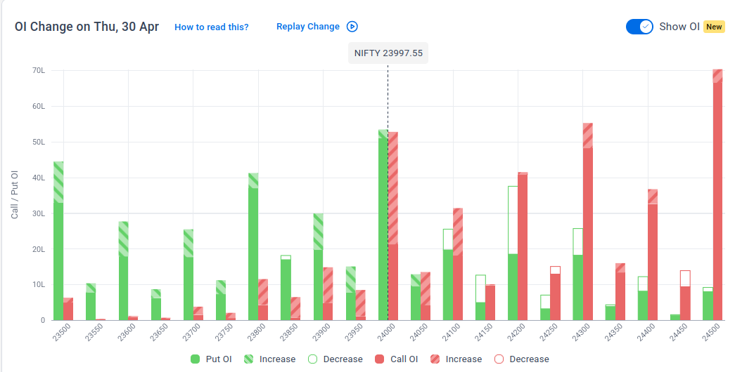The maximum Put Open Interest (OI) is observed at 24,000, followed by 23,500 & 23,800, suggesting support at 23,800-23,700.
