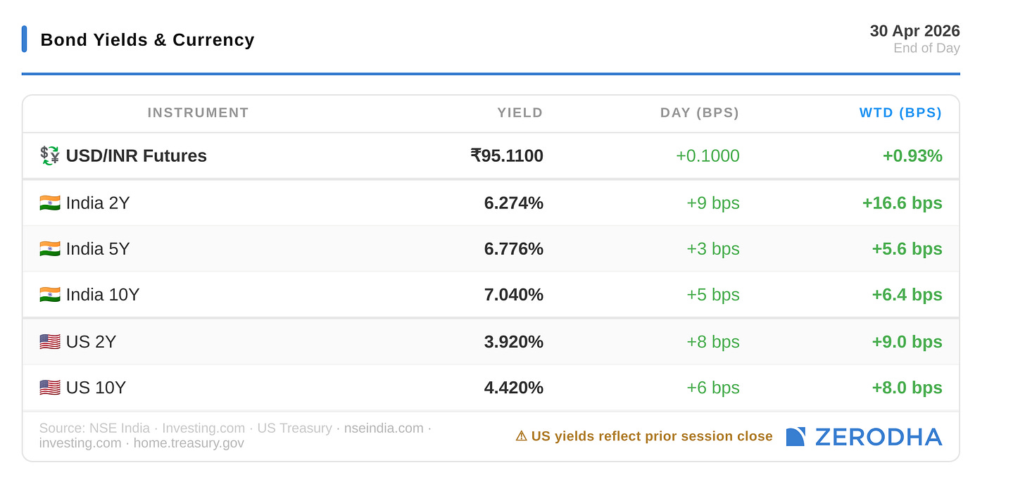 India 10Y yield sits at 7.04%, US 10Y at 4.42%. Rupee weakened 0.11% to 95.11, adding to the pressure on foreign flows.