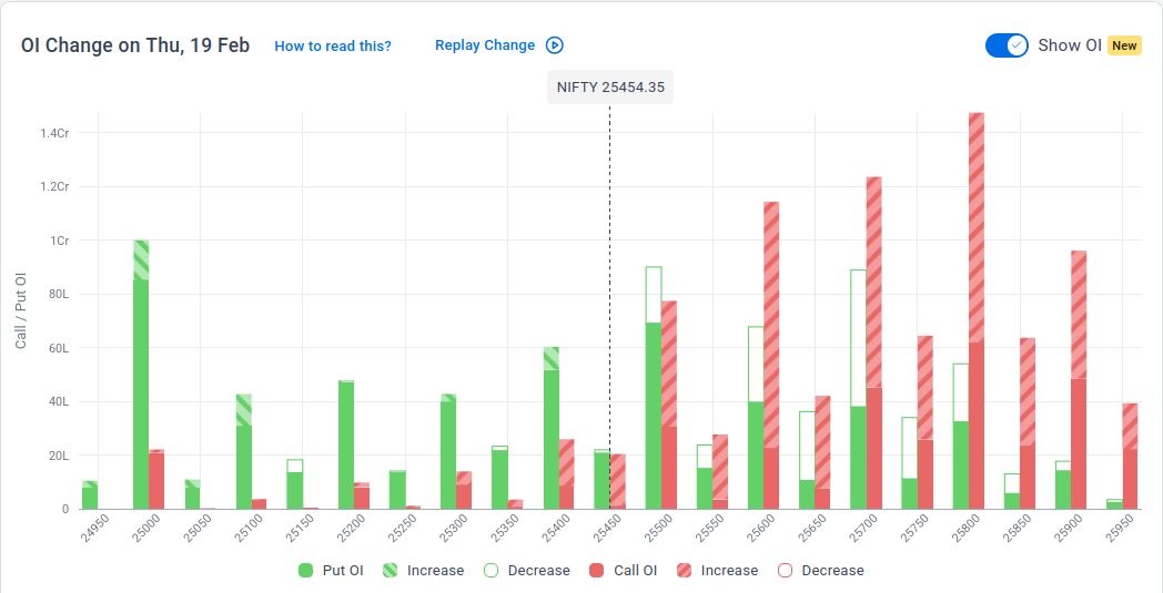 The maximum Put Open Interest (OI) is observed at 25,000, followed by 25,500, suggesting support at 25,300-25,200.