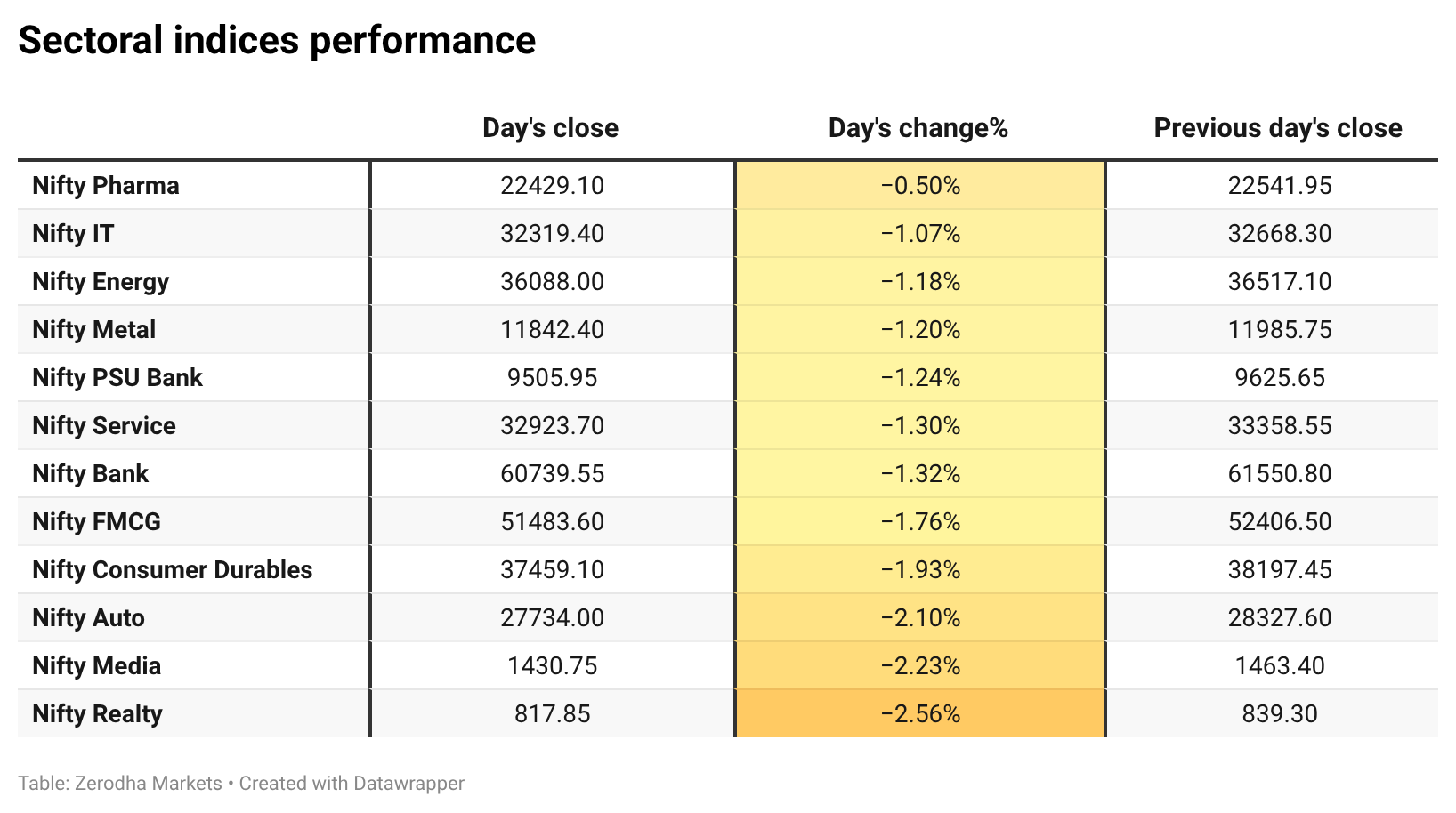 Nifty Pharma was a relatively better performer with a -0.50% cut, while Nifty Realty was the worst hit, down -2.56%. Overall, 0 sectors closed in green, and 12 sectors ended in red.