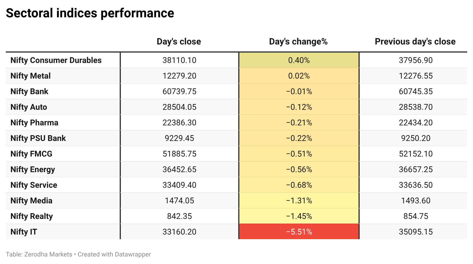 Nifty Consumer Durables was the top gainer today, up 0.40%, while Nifty IT was the top loser, down 5.51%. Overall, 2 sectors closed in green, and 10 sectors ended in red.