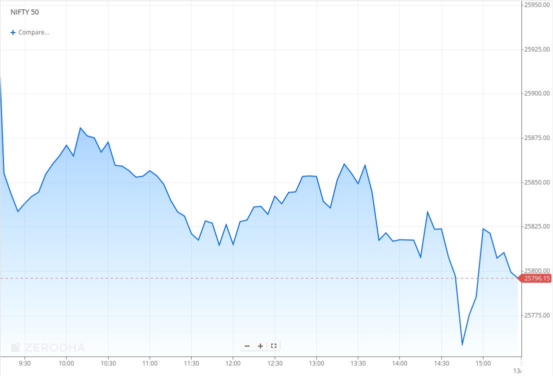 In the second half, the index stayed choppy and range-bound, oscillating between 25,810 and 25,850 for most of the afternoon. A sharp dip in the final hour briefly dragged Nifty to the 25,760–25,770 zone, but it recovered part of the losses to eventually settle at 25,807.20, ending marginally lower and extending the ongoing consolidation phase, with 26,000 continuing to remain elusive.
