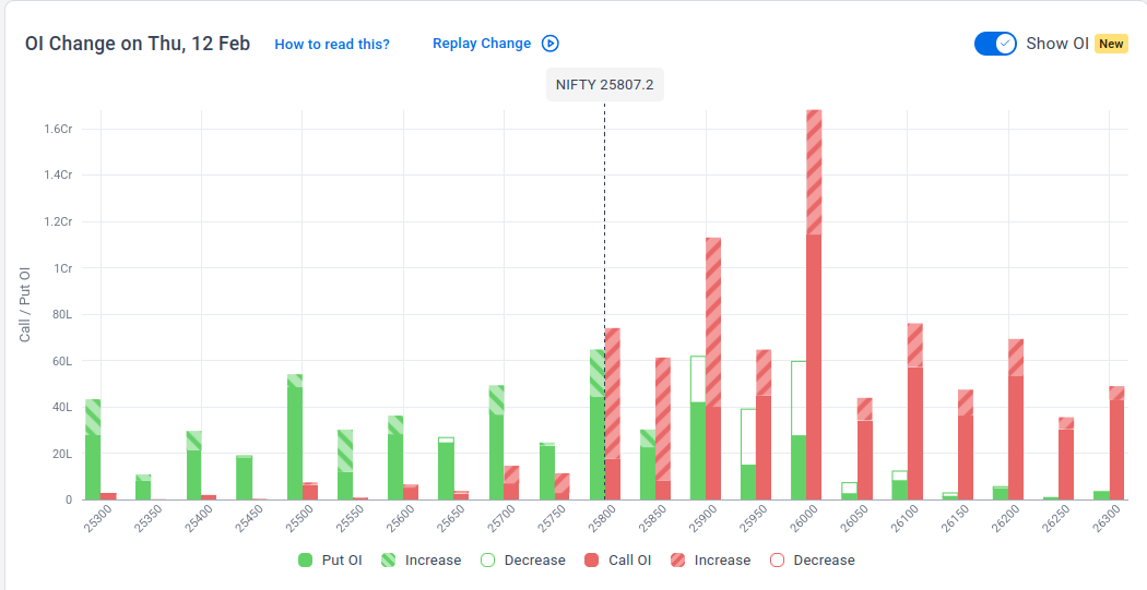 The maximum Call Open Interest (OI) is observed at 26,000, followed by 25,900, indicating potential resistance at the 26,000 -26,100 levels.