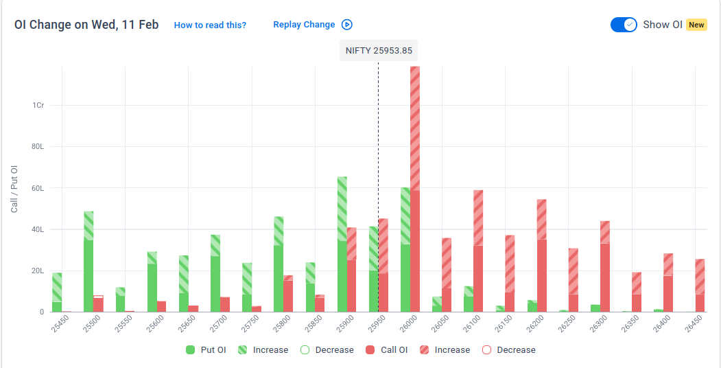The maximum Call Open Interest (OI) is observed at 26,000, followed by 26,100, indicating potential resistance at the 26,000 -26,100 levels.
