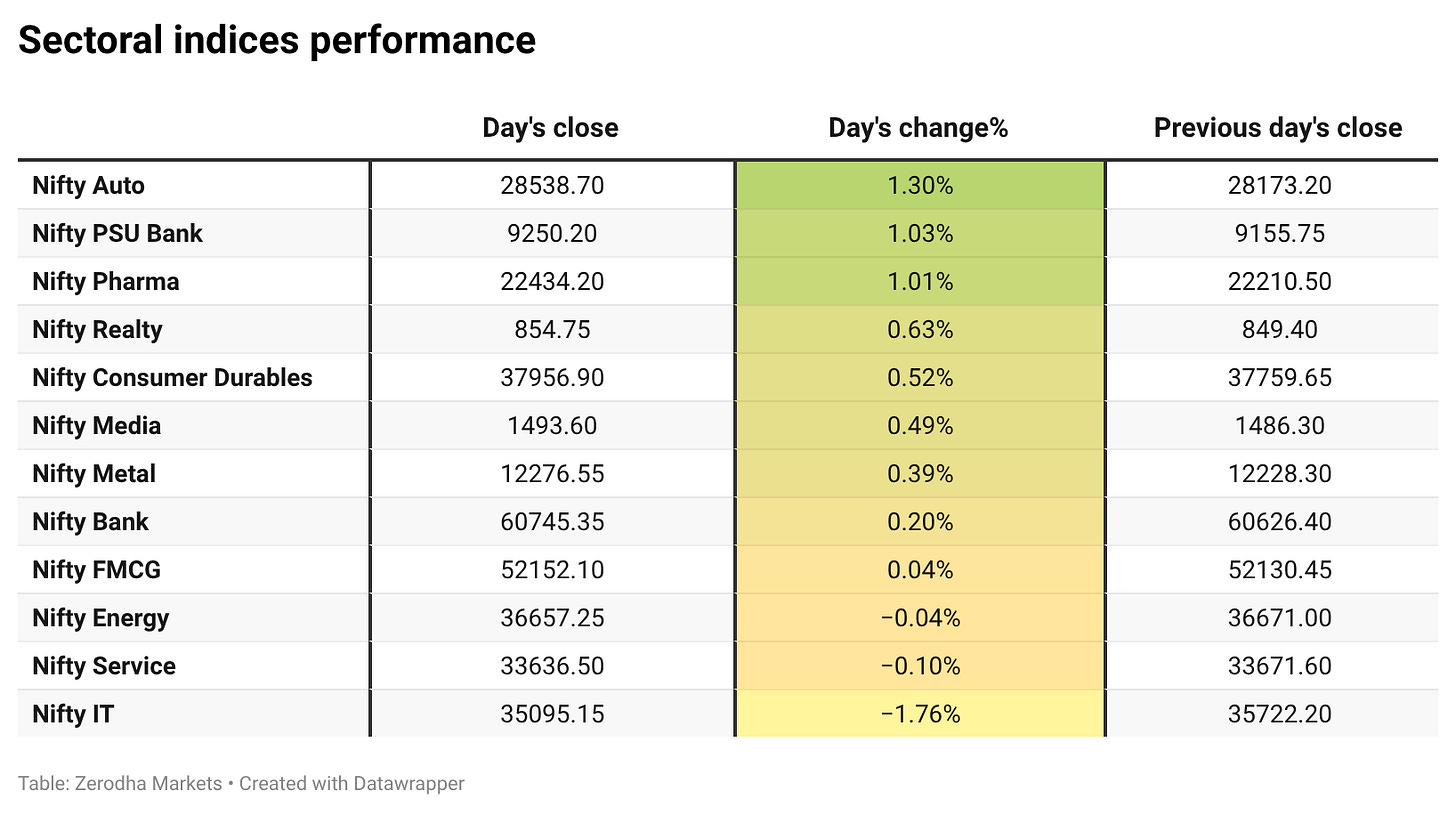 Nifty Auto was the top gainer today, rising 1.30%, while Nifty IT was the top loser, down 1.76%. Overall, 9 sectors closed in the green, and 3 sectors ended in the red.