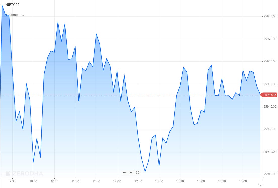 Through the late morning and into the first half, Nifty remained range-bound with a mild negative bias, gradually drifting lower and testing the 25,900–25,910 zone around 12:30 PM. In the second half, the index recovered slightly but largely remained in a range between 25,930 and 25,960, with follow-through remaining limited. Nifty eventually closed near 25,953.85, marking a sideways session with no clear trend.