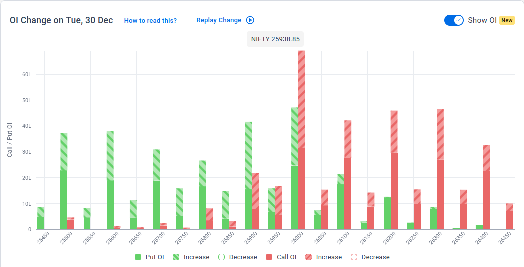 The maximum Put Open Interest (OI) is observed at 26,000, followed by 25,900, suggesting support at the 25,900 to 25,800 levels.