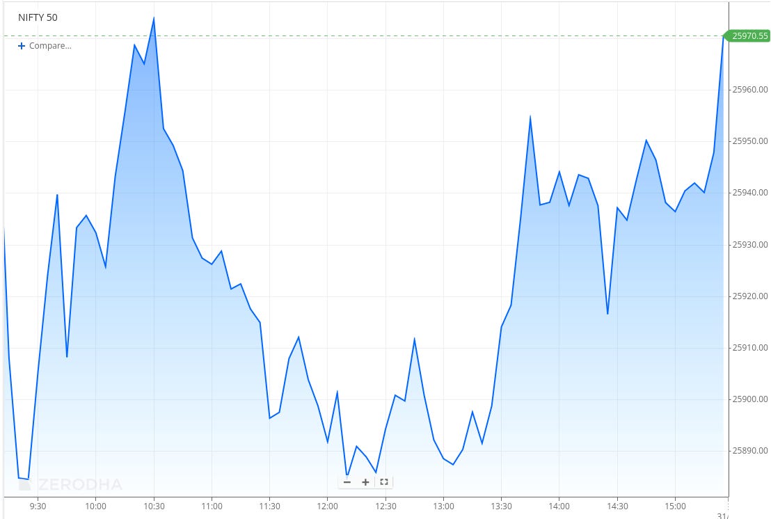 In the second half, after 1:30 PM, Nifty staged a steady recovery retracing most of the losses and climbing back toward the 25,960 zone. The index eventually closed flat at 25,938.85 after a highly volatile and expiry-bound session marked by sharp swings on both sides.