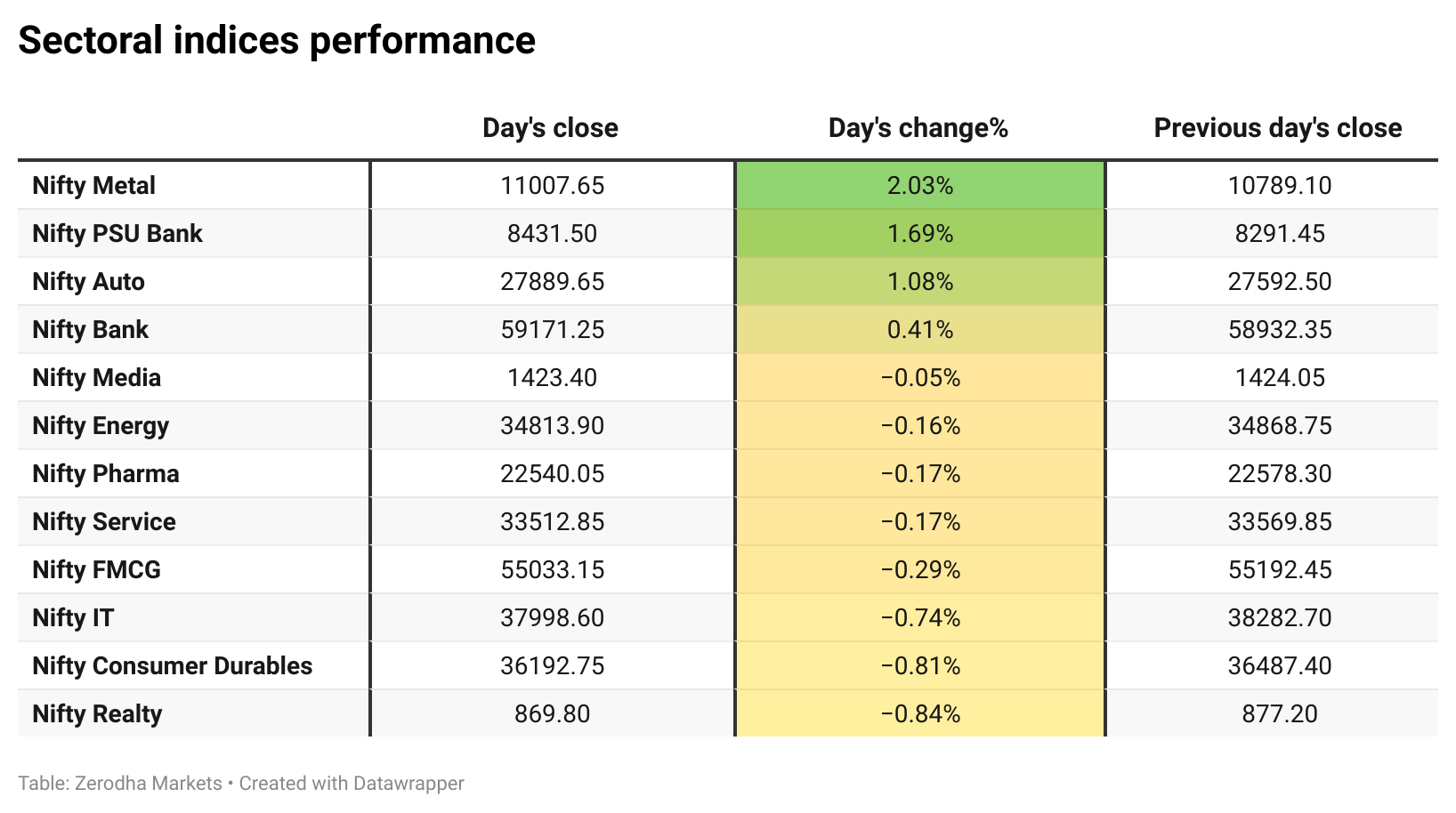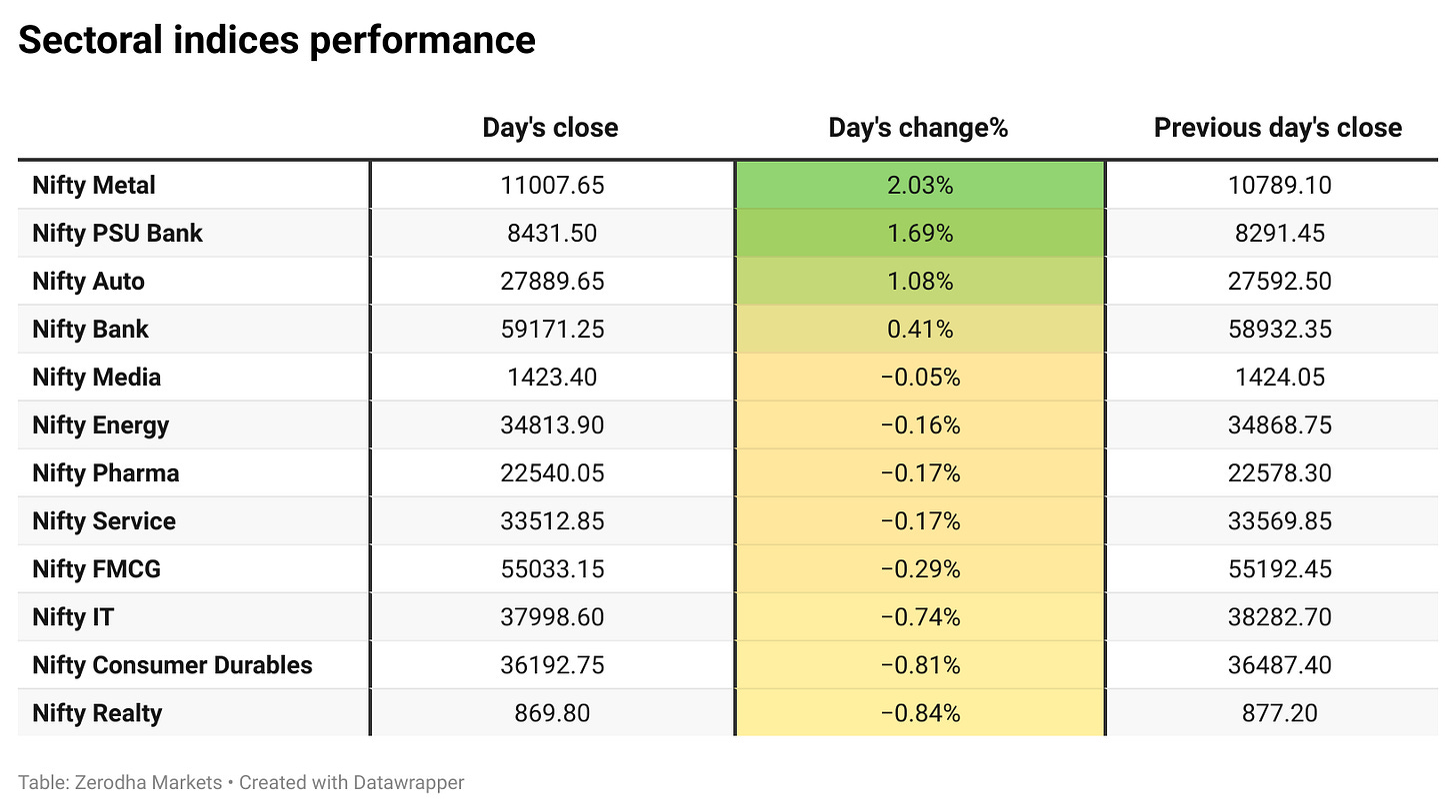 Nifty Metal was the top gainer, rising 2.03%, while Nifty Realty was the worst performer with a 0.84% decline. Out of the 12 sectoral indices, 4 closed in the green and 8 ended in the red, indicating a broadly negative market breadth for the day.