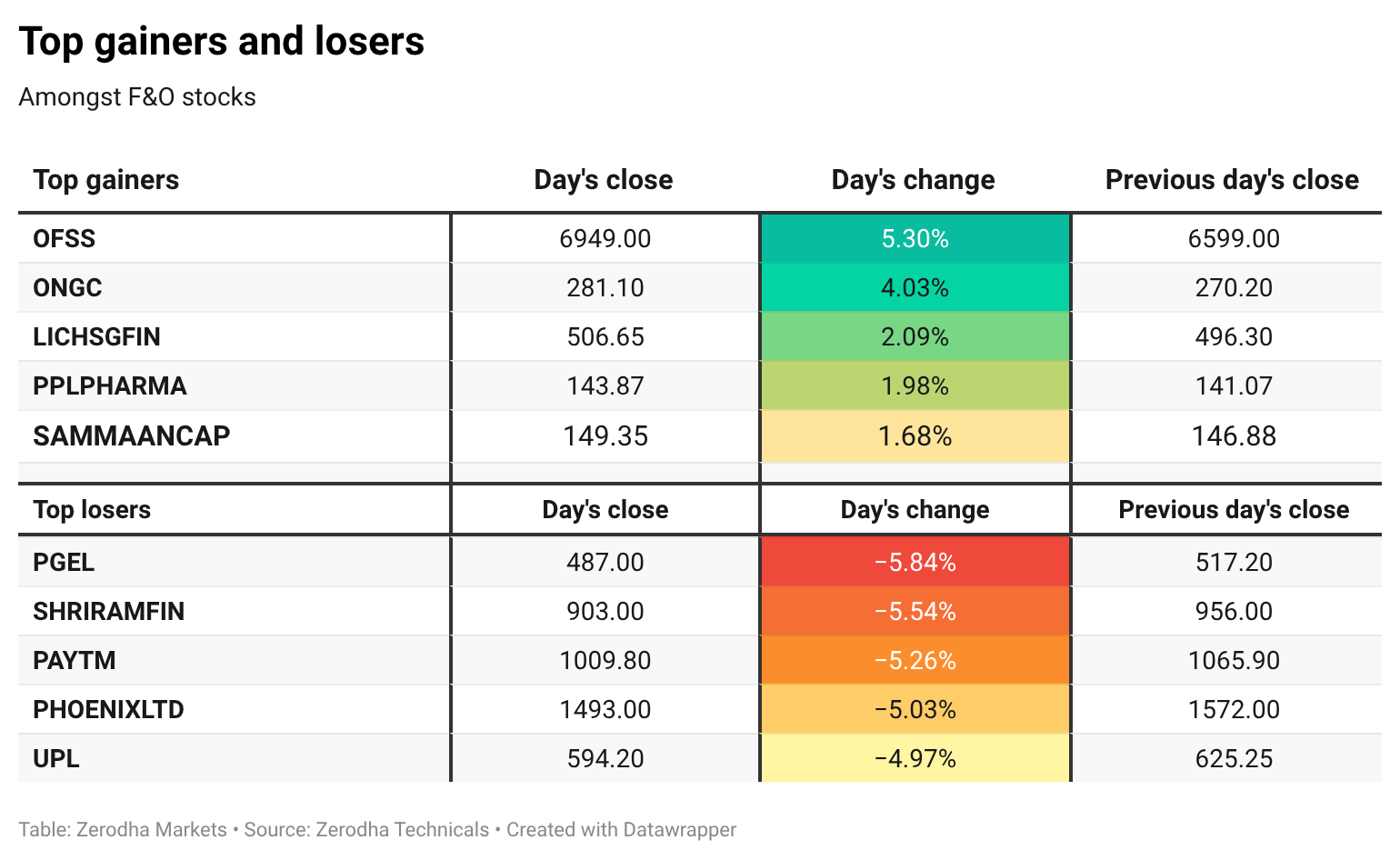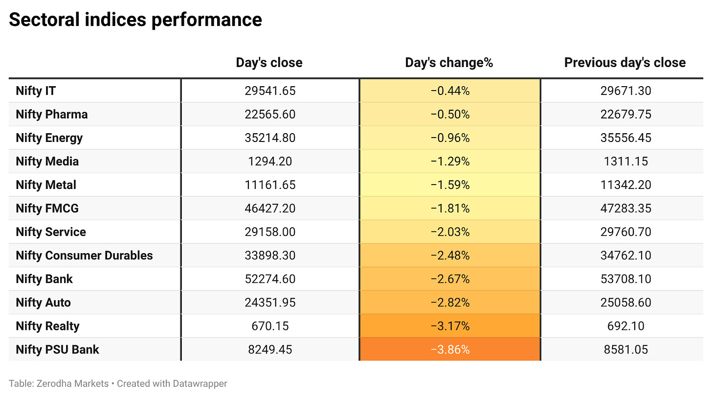 Sectoral performance was broadly weak today, with no sectors closing in the green. Nifty IT was the least negative, down 0.44%, while Nifty PSU Bank was the top loser, falling 3.86%.