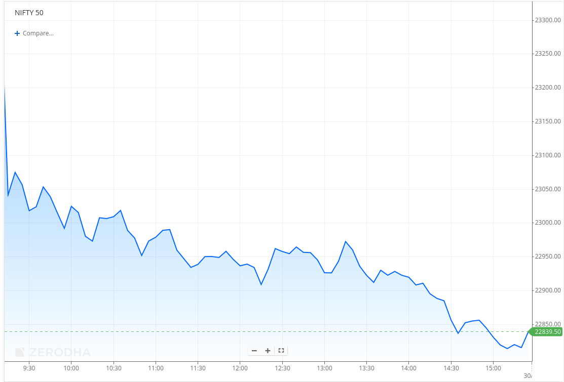 Nifty opened with a gap down of 132 points at 23,174, following weak global cues, and immediately started to go down, with the index going below 23,000 within the first hour.