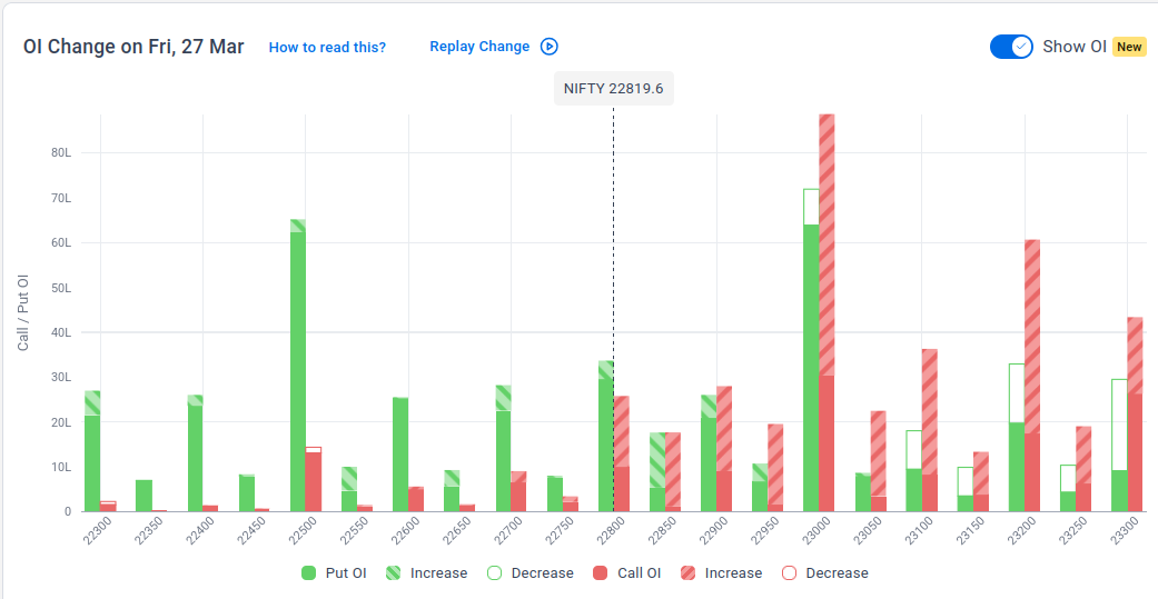 The maximum Put Open Interest (OI) is observed at 22,500, followed by 23,000, suggesting support at 22,600-22,500.