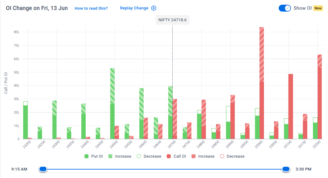 The maximum Put Open Interest (OI) is observed at 24,500, followed closely by 24,700, suggesting strong support at 24,600 to 24,500 levels.