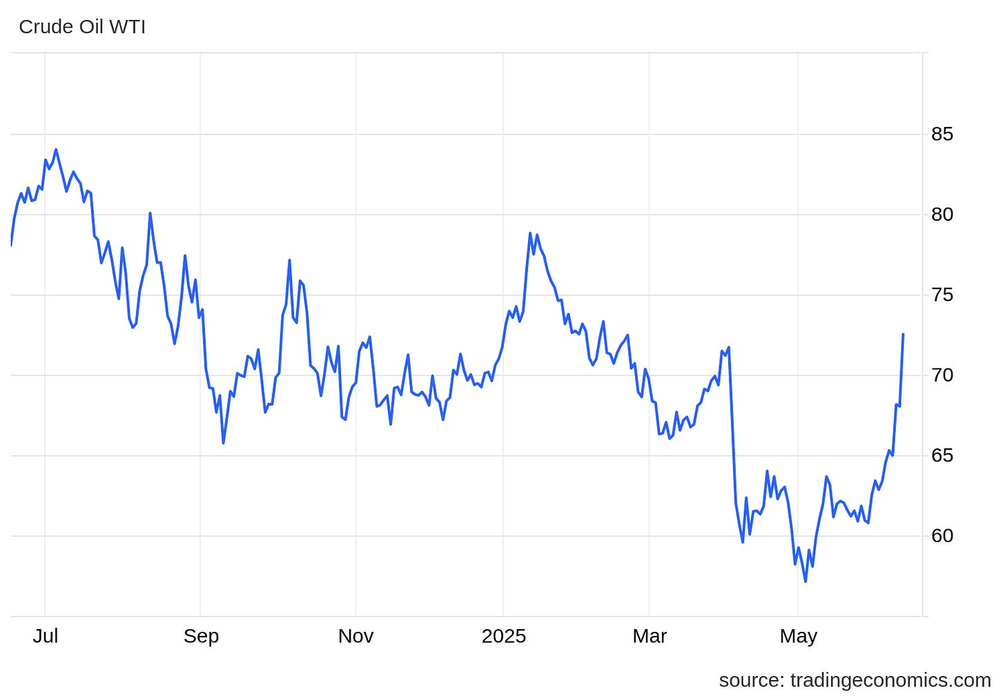 WTI crude briefly topped $77 before settling near $73, driven by fears of supply disruption after Israel’s strike on Iran and risks to the Strait of Hormuz. US crude stock draws and rising Fed rate cut expectations also supported prices. Dive deeper