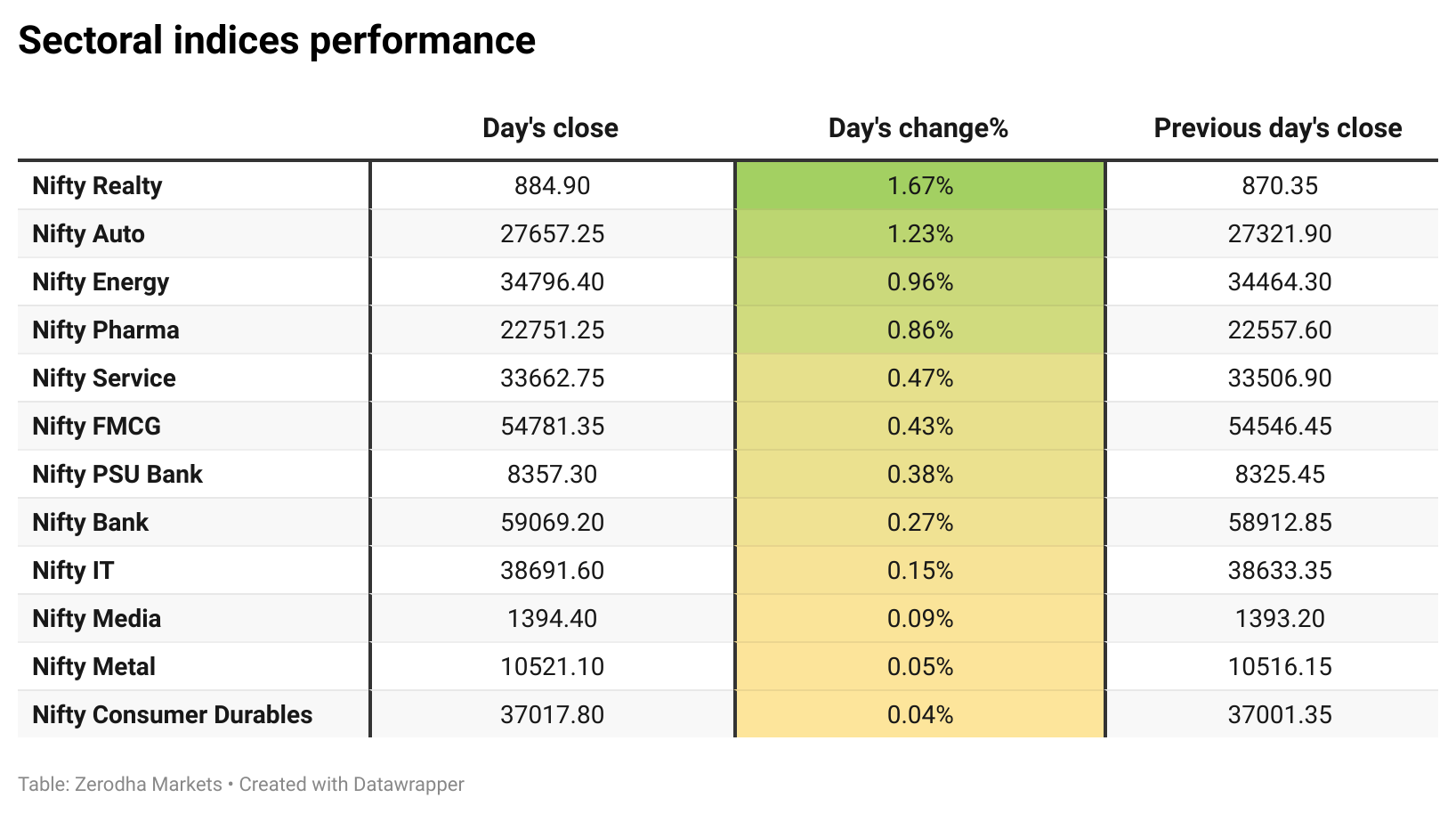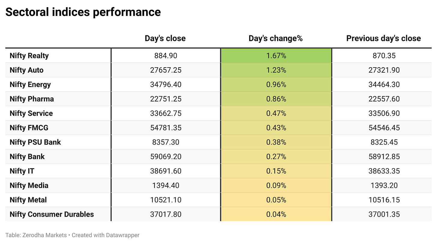 Nifty Realty led the gains with a strong 1.67% rise, while there were no losing sectors for the day. All 12 sectoral indices ended in the green, reflecting broad-based market strength.
