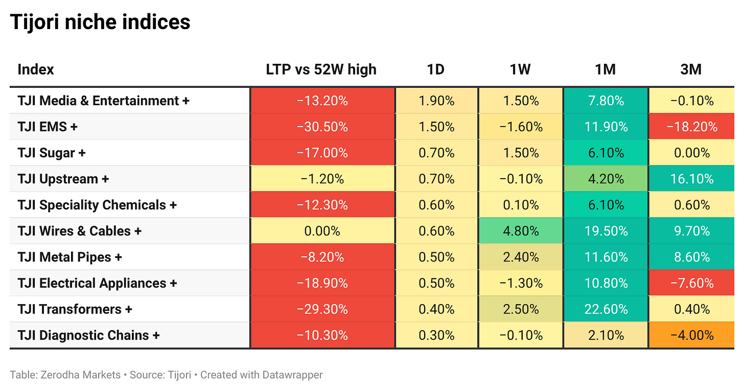 Tijori is an investment research platform that has constructed niche indices for various themes and sub-sectors. They help you understand the market performance of narrow slices of the market. You can also track the Promoter buying and other interesting stuff, like Capex activity by the companies in the Tijori App’s idea dashboard