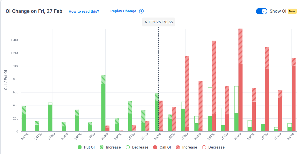 The maximum Put Open Interest (OI) is observed at 25,000, followed by 25,200, suggesting support at 25,100-25,000.