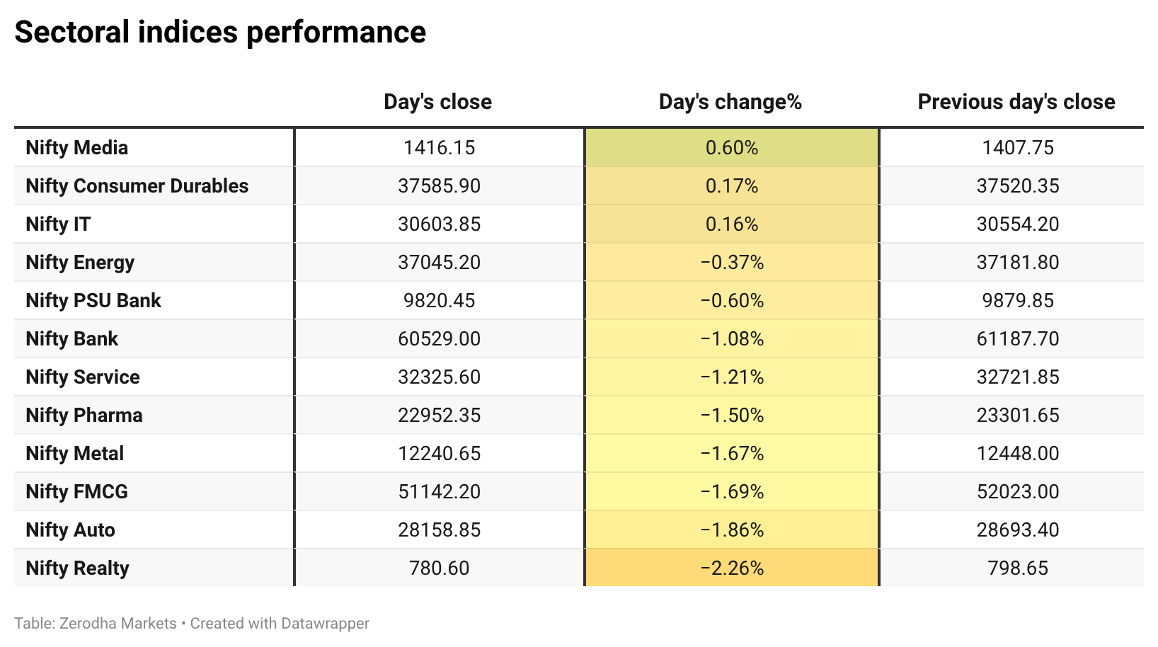 Nifty Media was the top gainer, up 0.60%, while Nifty Realty was the top loser, down 2.26%. Overall, 3 sectors closed in green, and 9 sectors ended in red.