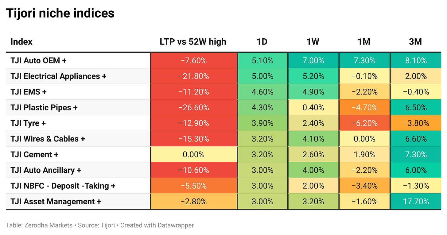 Tijori is an investment research platform, and they have constructed niche indices for various themes and sub-sectors. They help you understand the market performance of narrow slices of the market. You can also track the Promoter buying and other interesting stuff like Capex activity by the companies in the Tijori App’s idea dashboard