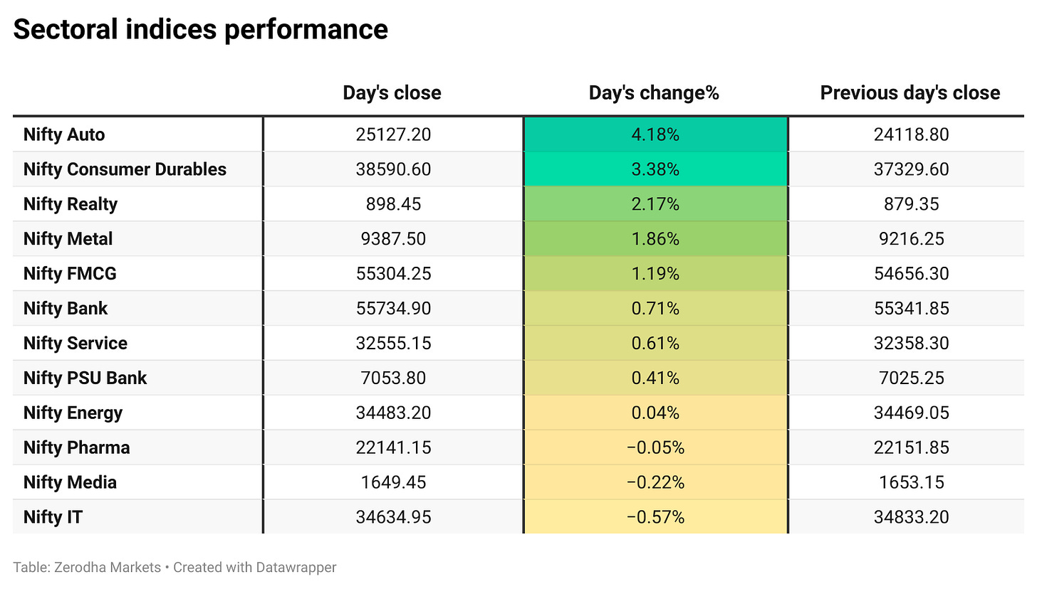 Nifty Auto emerged as the top gainer, rising sharply by 4.18%, followed by Nifty Consumer Durables and Nifty Realty, which gained 3.38% and 2.17% respectively. On the losing side, Nifty IT was the worst performer, slipping 0.57%, trailed by Nifty Media and Nifty Pharma, which fell 0.22% and 0.05% respectively. Out of the 12 sectoral indices, 9 closed in the green while 3 ended in the red, reflecting a broadly positive market trend.
