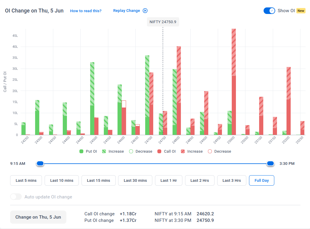 The maximum Call Open Interest (OI) is observed at 25,000, followed closely by 24,800, suggesting strong resistance at 24,800 - 25,000 levels.