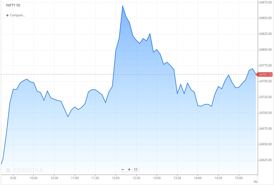 Nifty opened with a 71-point gap up following positive global cues. After filling the gap within the first five minutes, the index surged by 120 points to test the 24,750 level. It then consolidated between 24,700 and 24,750 for about an hour until noon. Post that, Nifty rallied nearly 175 points to make an intraday high around 24,900. However, with volatility rising due to the weekly expiry, the index witnessed a sharp sell-off, losing 180 points by 2 PM. In the final hour, it traded in a narrow range and eventually closed at 24,750.90, up by 0.53%.