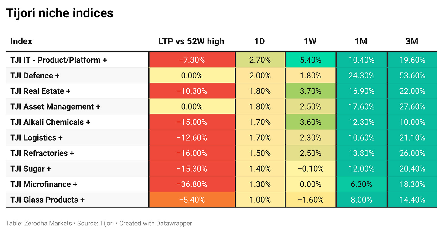 Tijori is an investment research platform, and they have constructed niche indices for various themes and sub-sectors. They help you understand the market performance of narrow slices of the market. You can also track the Promoter buying and other interesting stuff like Capex activity by the companies in the Tijori App’s idea dashboard