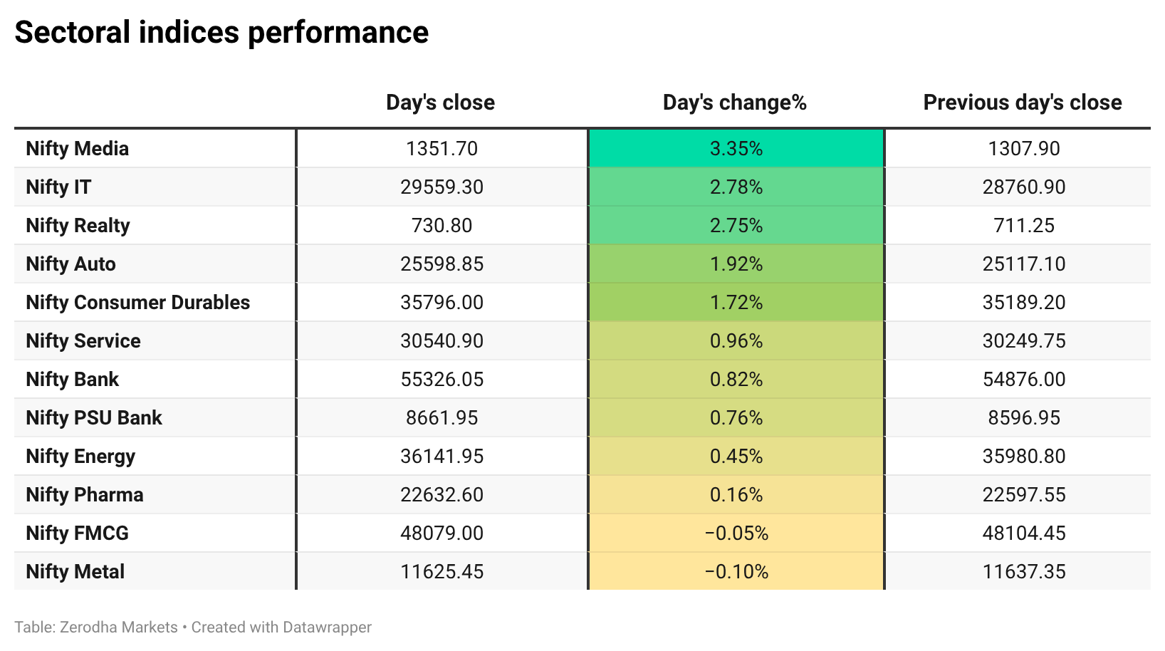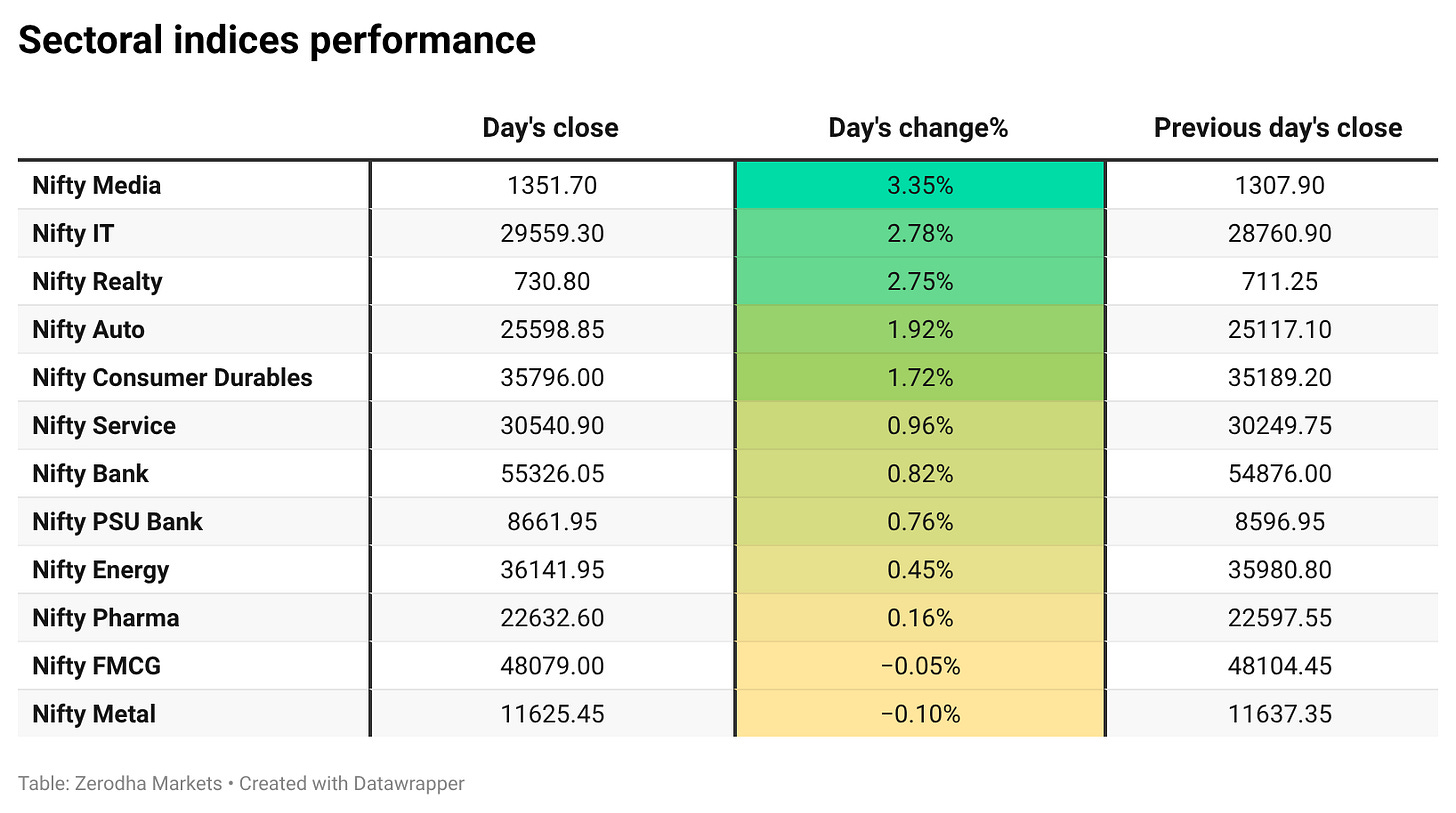 Sectoral momentum was broadly positive today, with Nifty Media leading the gains, up 3.35%, while Nifty Metal was the top loser, slipping 0.10%. Overall, 10 sectors closed in green, and 2 sectors ended in red.