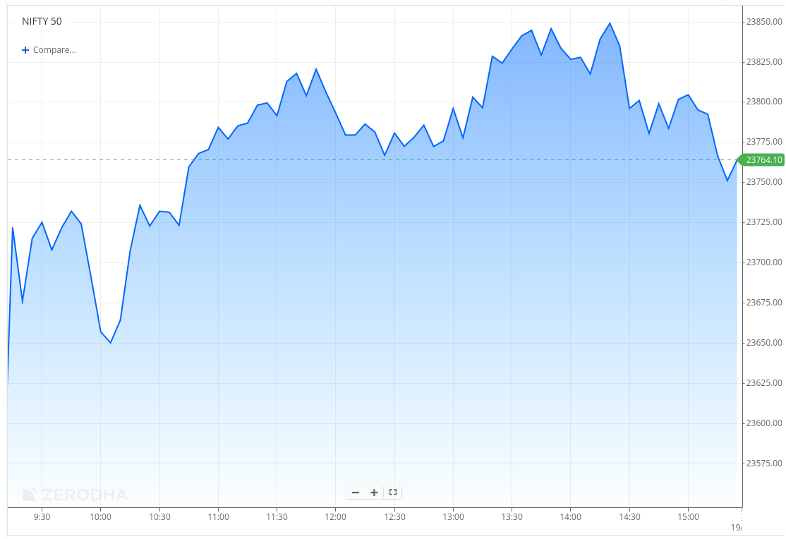 By noon, Nifty continued to trade in a narrow range between 23,760 and 23,800 with a slight upward bias, reflecting sustained buying interest.