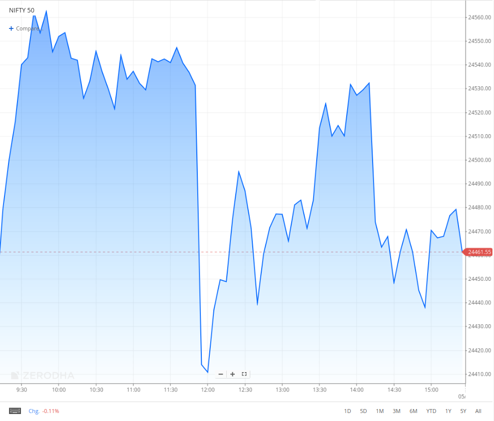 Nifty 50 opened 31 points higher at 24,488.75, surged to 24,573.20 in the first half-hour, and then traded in a tight range around 24,530-24,560 until 11:45 AM. A sharp sell-off followed, dropping it to 24,370, but the index quickly recovered to 24,530 by 2:00 PM. It eventually drifted lower to close nearly flat at 24,467.45, up 0.04%.