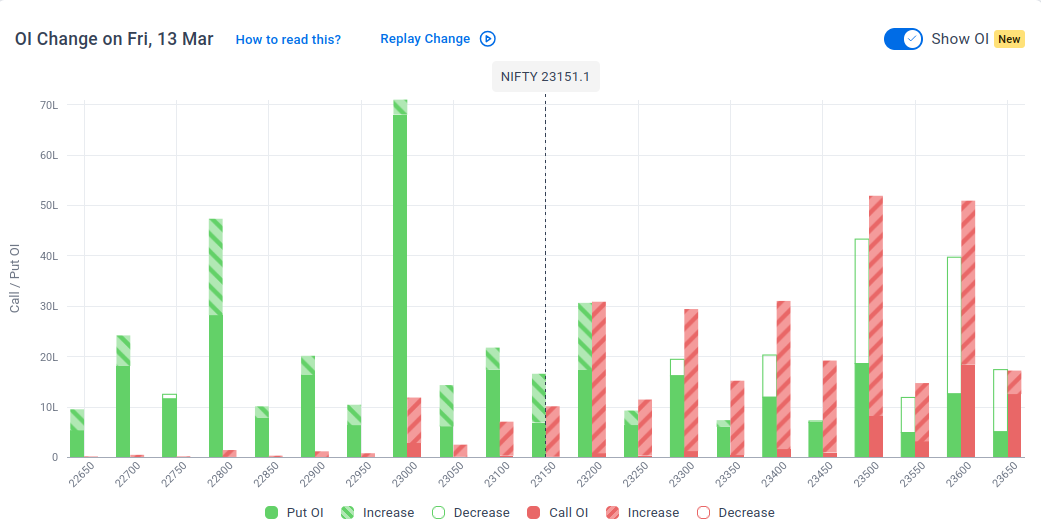 The maximum Put Open Interest (OI) is observed at 23,000, followed by 22,800, suggesting support at 23,000-22,900.