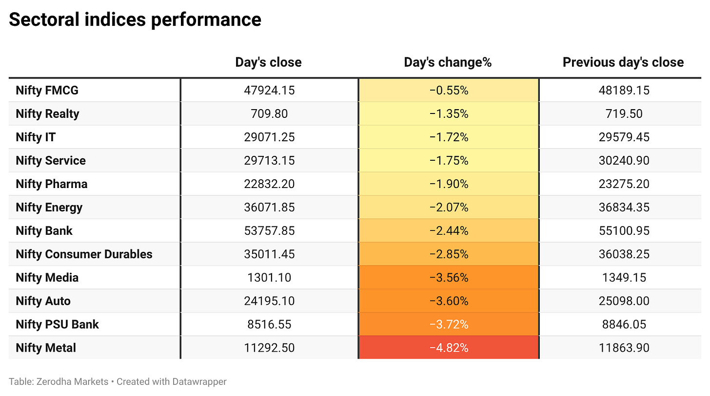 All sectoral indices ended in the red today. Nifty FMCG was the least negative performer, down 0.55%, while Nifty Metal was the top loser, plunging 4.82%.