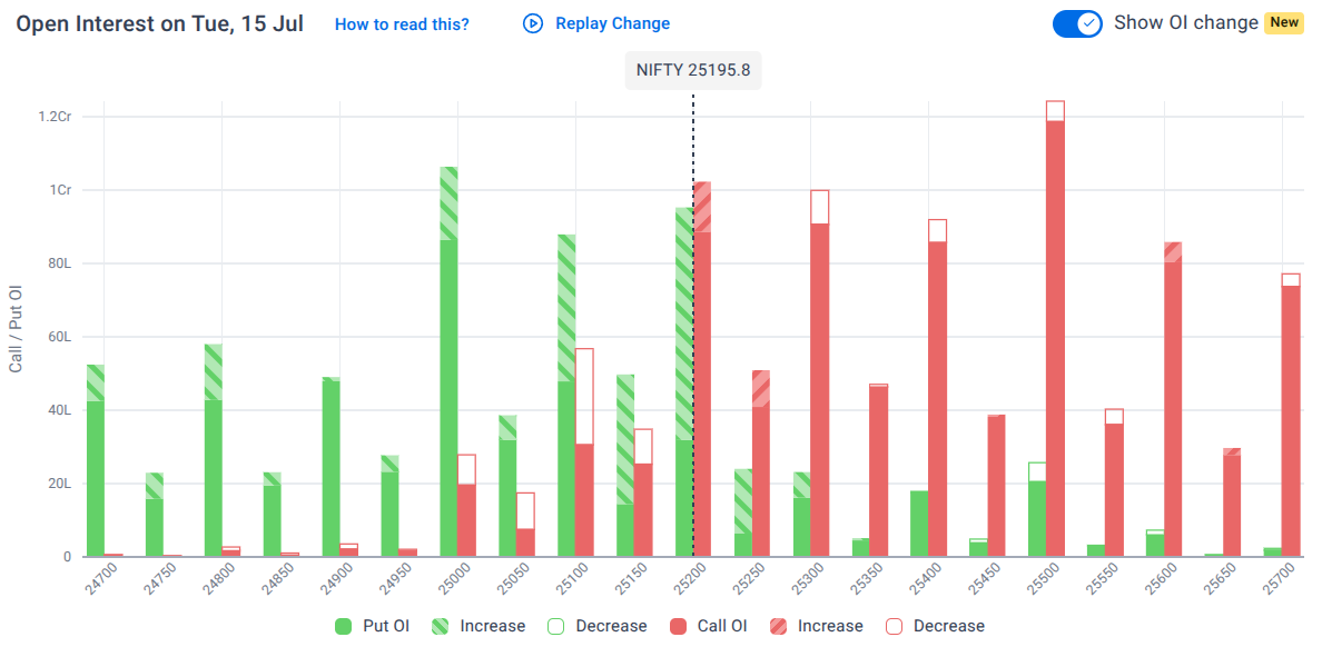 The maximum Call Open Interest (OI) is observed at 25,500, followed by 25,200 and 25,300, suggesting immediate resistance at 25,200.