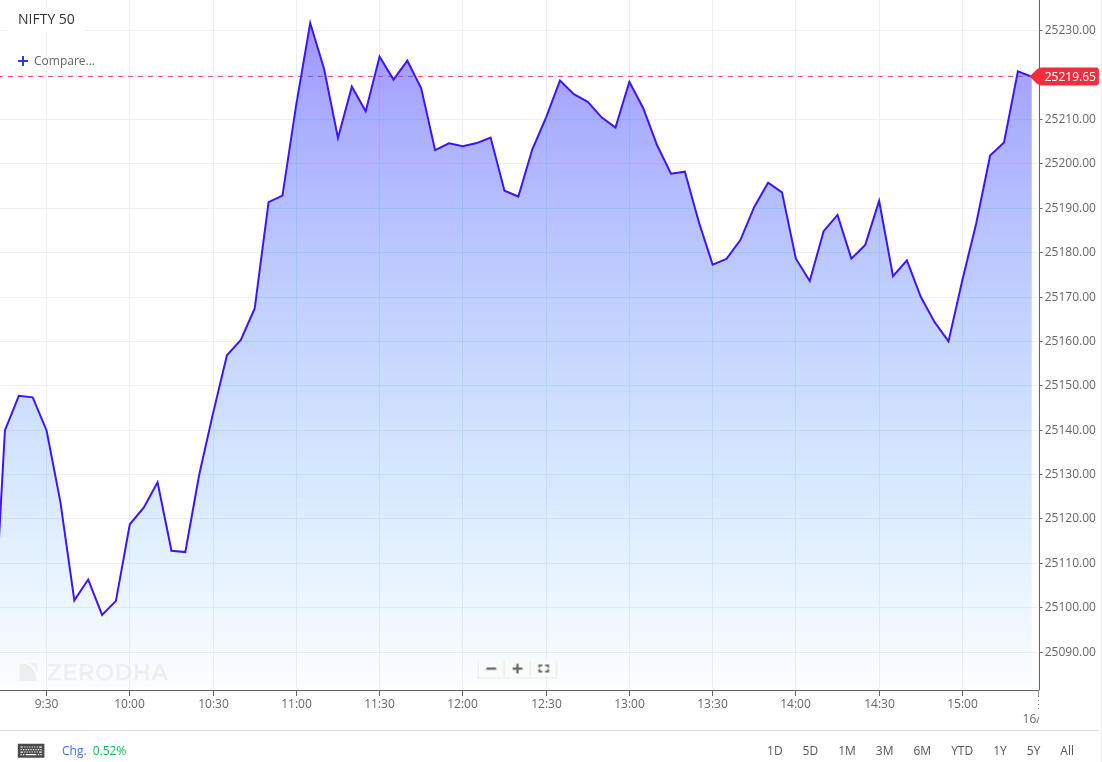 Benchmark indices opened flat today, with Nifty opening at 25,089, but surged during the day to close at 25195, 113 points (0.45%) higher, ending a four-day losing streak as the latest inflation numbers boosted market sentiment.