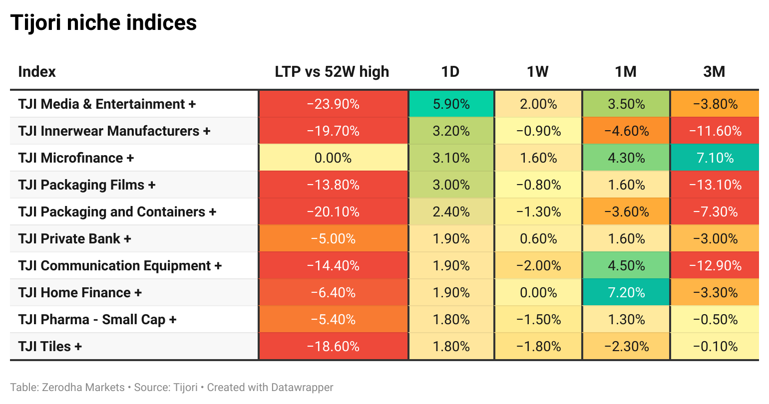 Tijori is an investment research platform, and they have constructed niche indices for various themes and sub-sectors. They help you understand the market performance of narrow slices of the market. You can also track the Promoter buying and other interesting stuff like Capex activity by the companies in the Tijori App’s idea dashboard