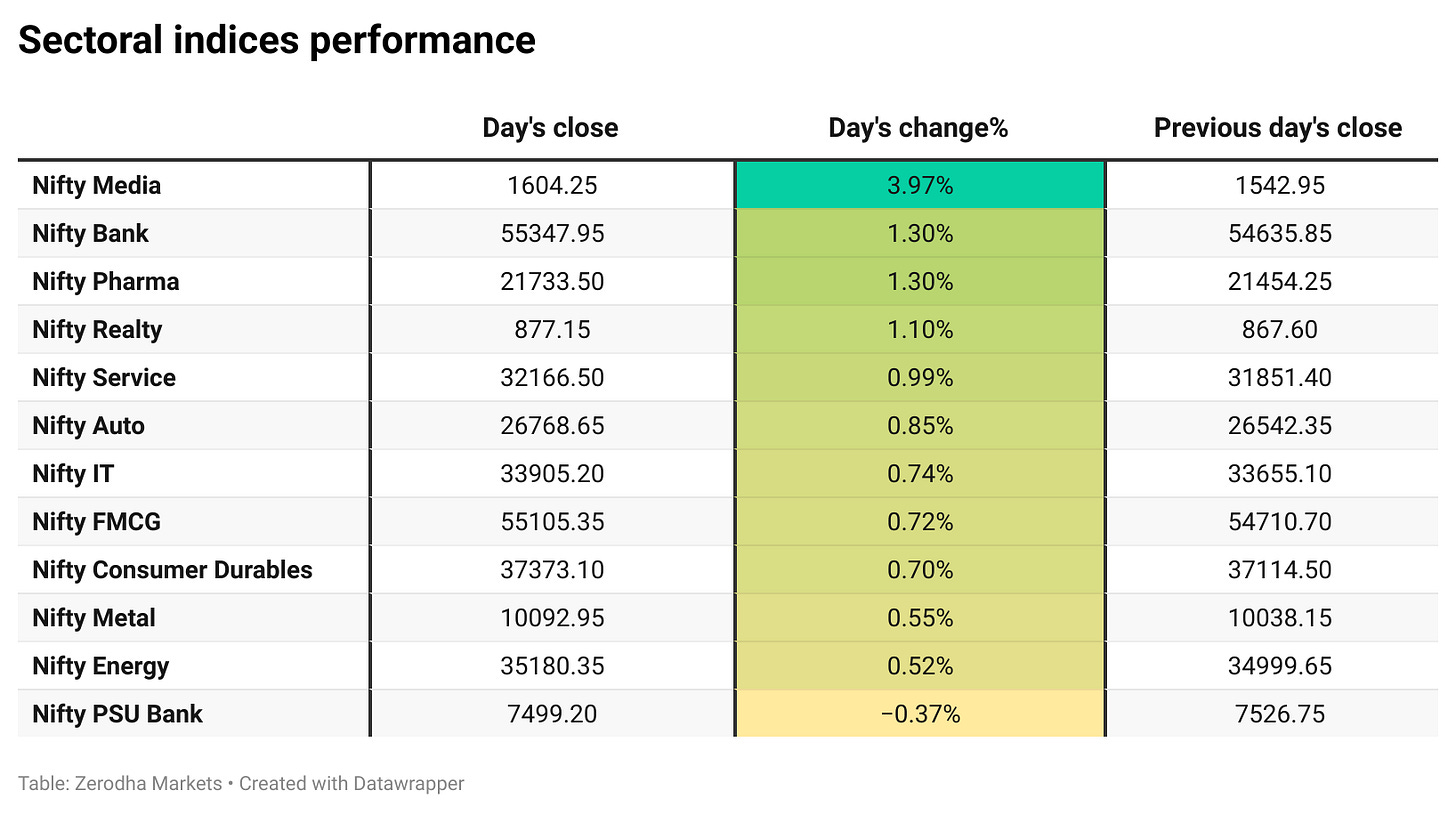 The top-gaining sector for the day was Nifty Media, which surged 3.97%, while Nifty PSU Bank was the only sector to close in the red, declining 0.37%. Out of the 12 sectoral indices, 11 ended in the green and only 1 closed in the red, indicating a broad-based recovery across sectors.