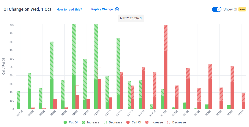 The maximum Put Open Interest (OI) is observed at 24,700, followed by 24,600, suggesting strong support at 24,700 to 24,600 levels.