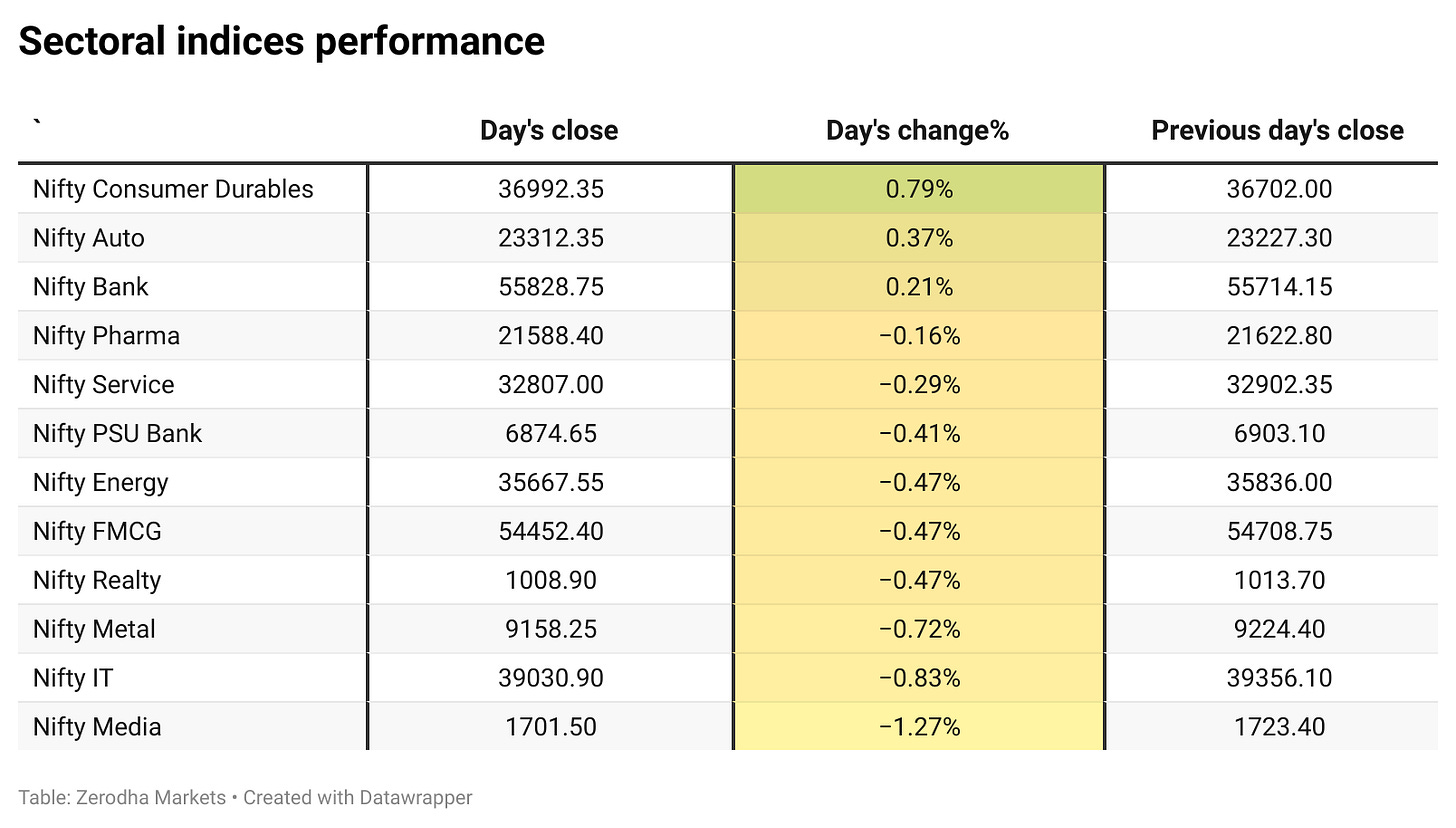 The top-gaining sector for the day was Nifty Consumer Durables, which rose by 0.79%, while the worst-performing sector was Nifty Media, which declined by 1.27%. Out of the 12 sectoral indices, 3 closed in the green—Consumer Durables, Auto, and Bank—while 9 ended in the red, led by Media, IT, and Metal.